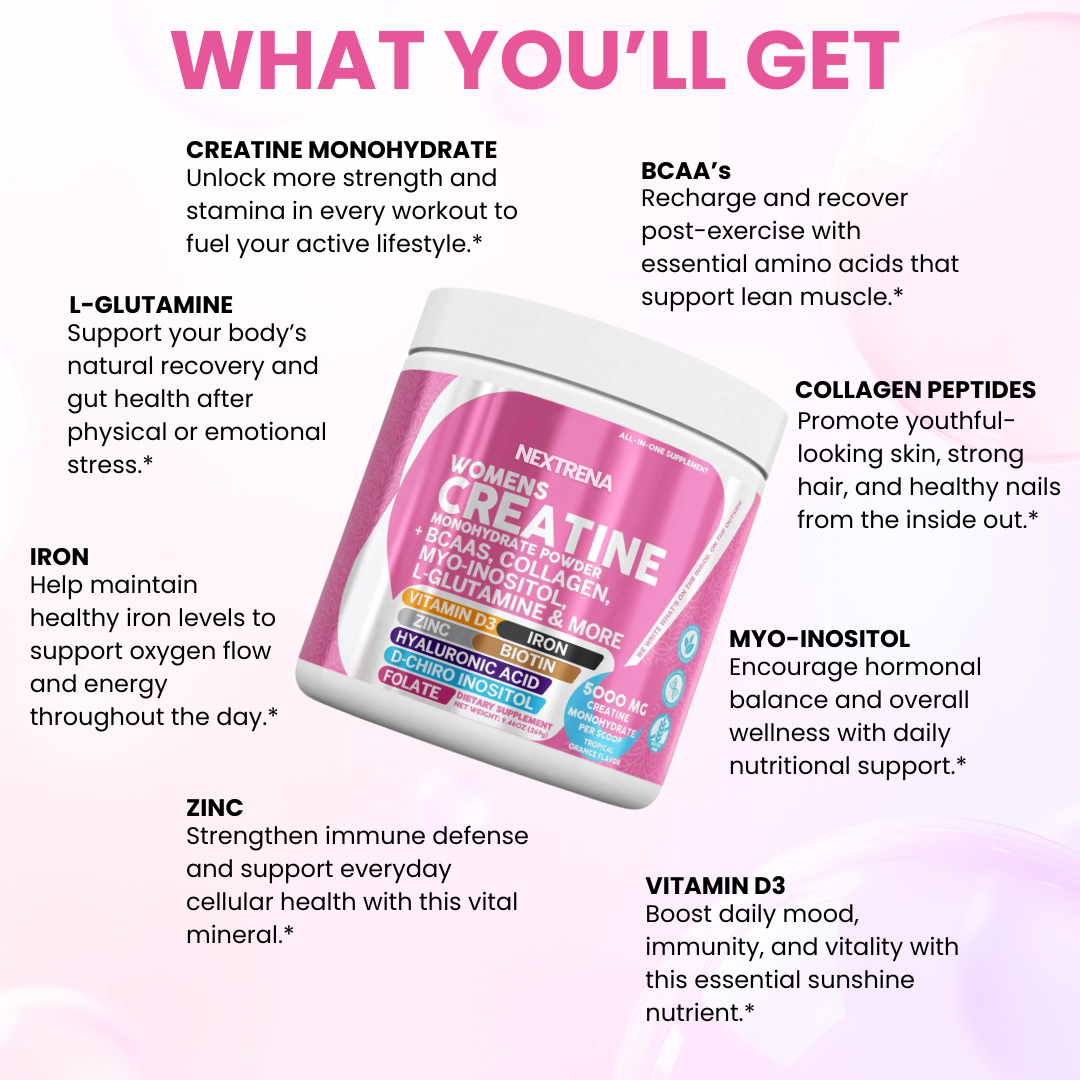 We combine clean creatine and BCAAs to help you build strength, grow your glutes, and recover faster — all without bloating or that bulky look. It’s designed for women who want to feel stronger, look more sculpted, and stay consistent without the side effects of traditional creatine.